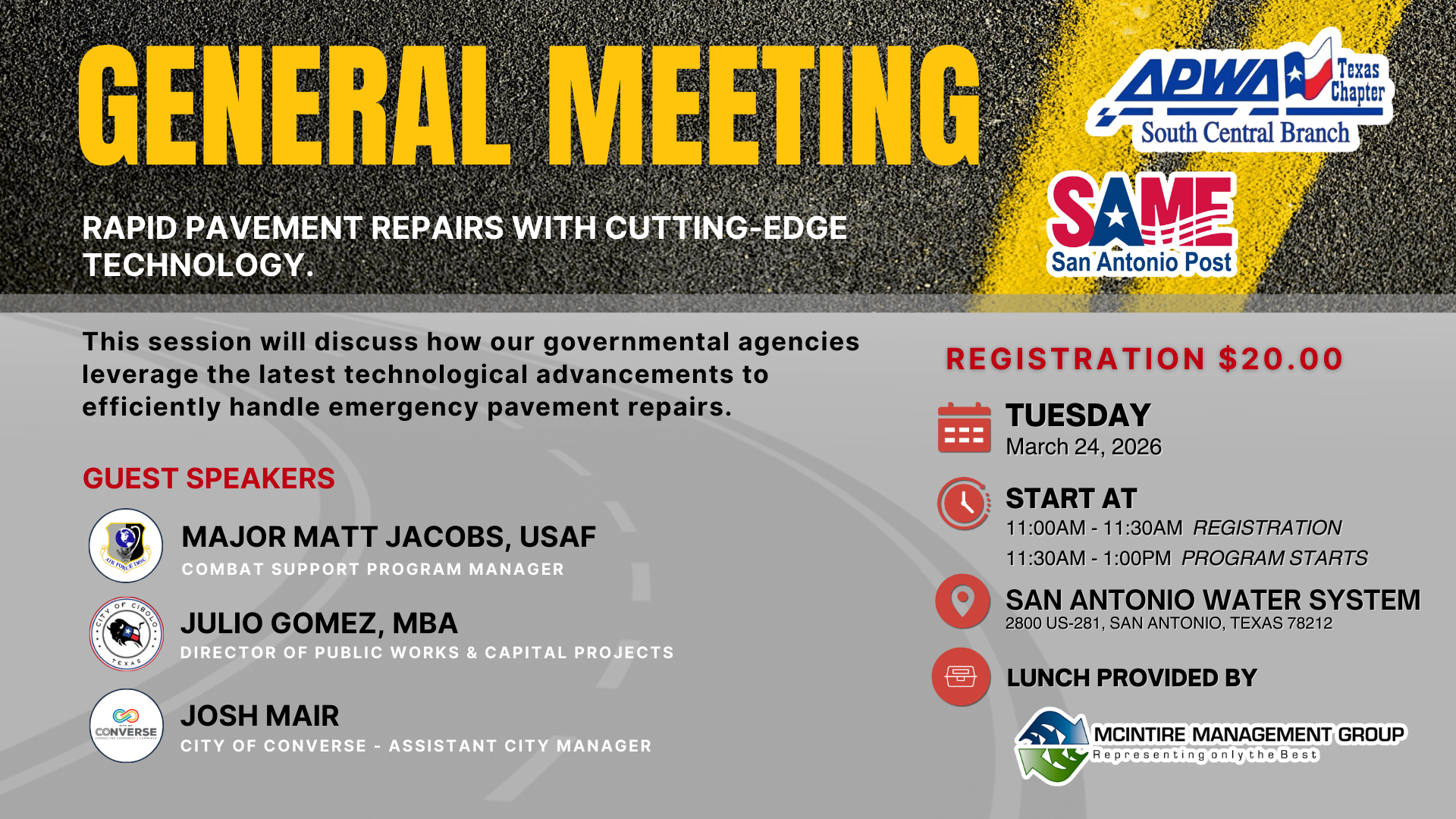 March General Meeting Tuesday, March 24, 2026 11:00 AM 1:00 PM San Antonio Water System Customer Center 2800 U.S. 281 San Antonio, TX, 78212 United States (map) Google Calendar ICS Register